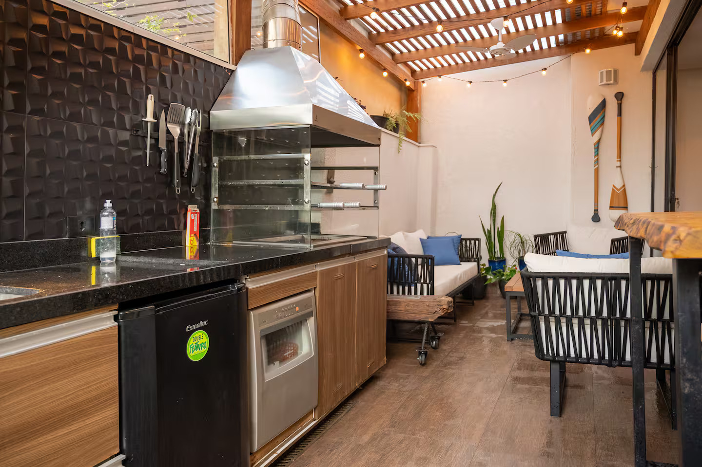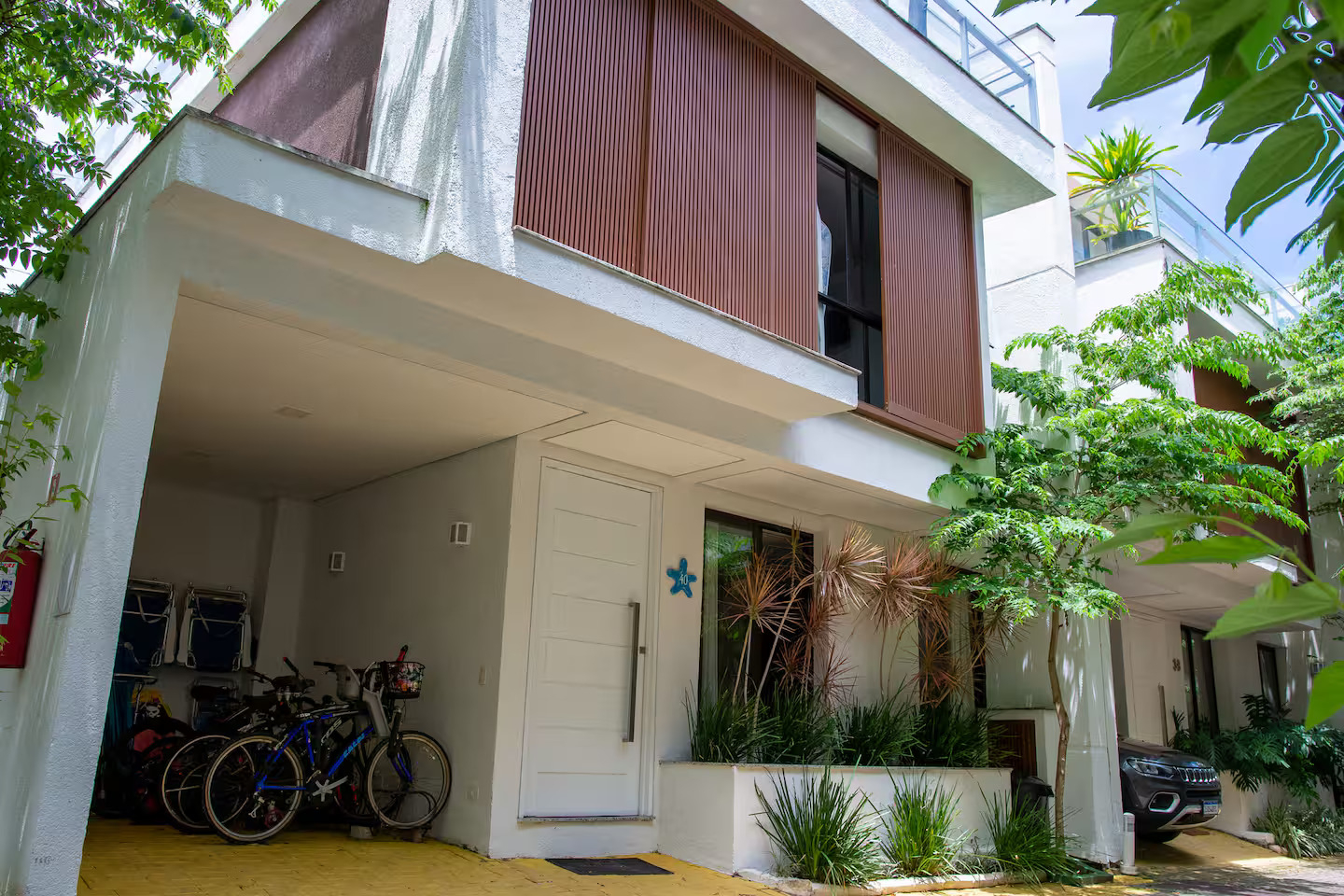Equipada com churrasqueira, bicicletas e kit praia (cadeiras, guarda-sol e carrinho).