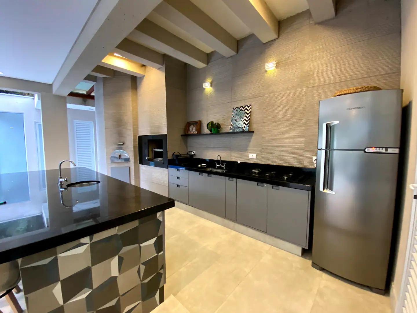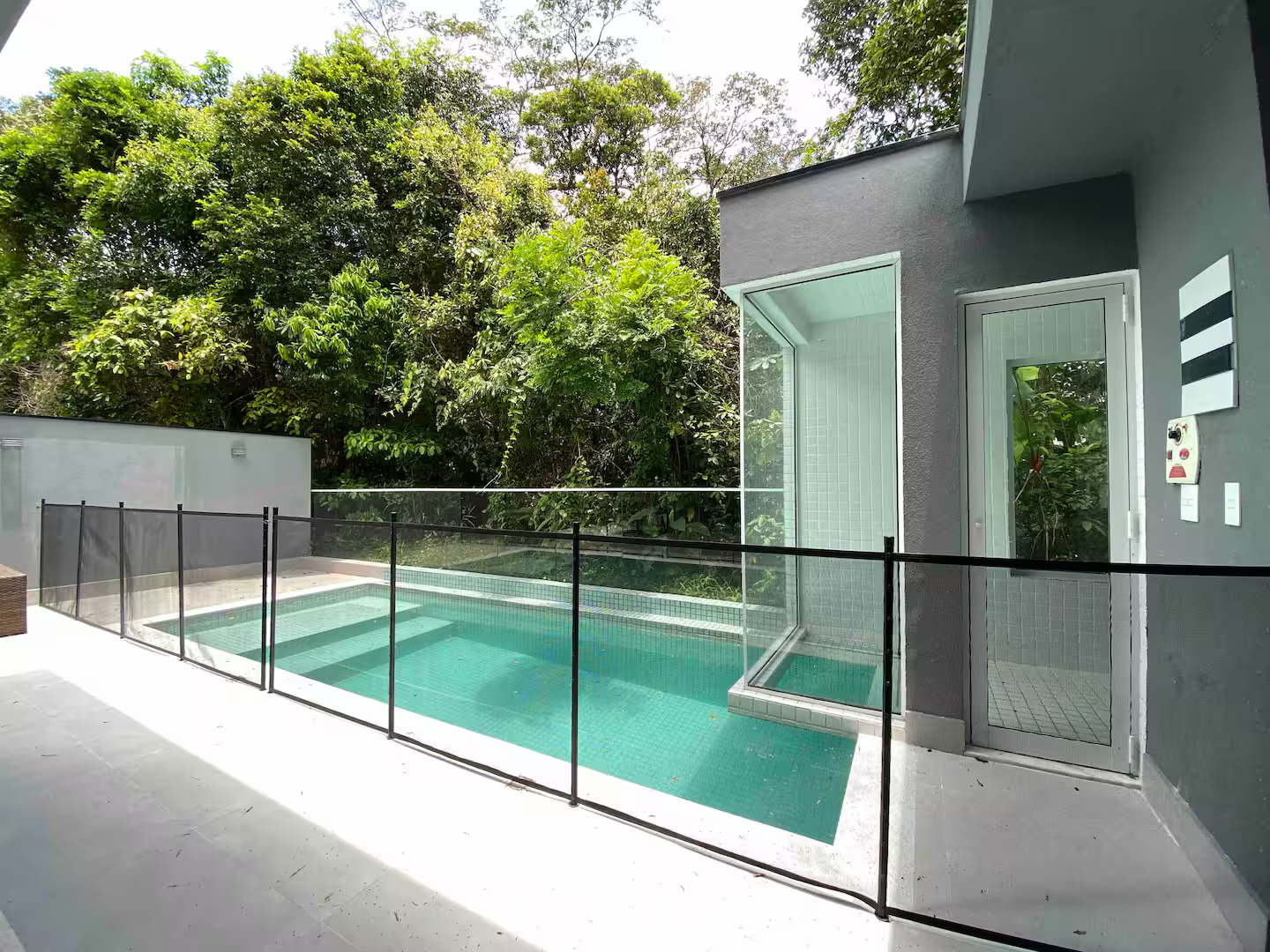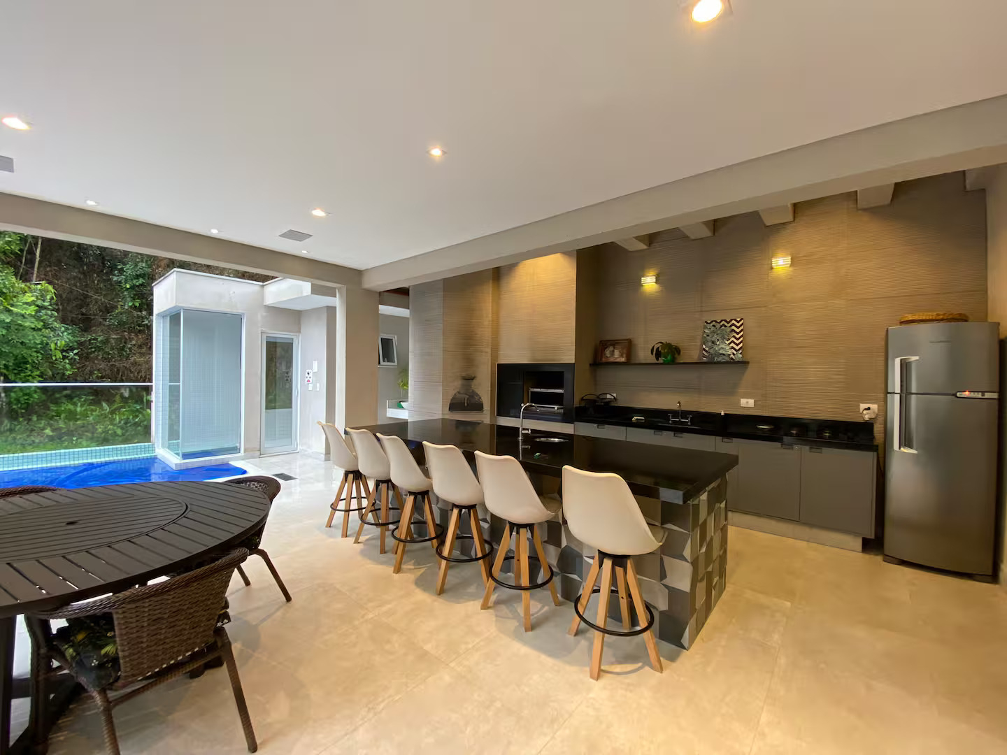 A casa possui 2 cozinhas equipadas, churrasqueira, forno a lenha, sauna e piscina com vista para a mata preservada. A cerca da piscina pode ser removida, ideal para quem viaja com crianças ou pets.