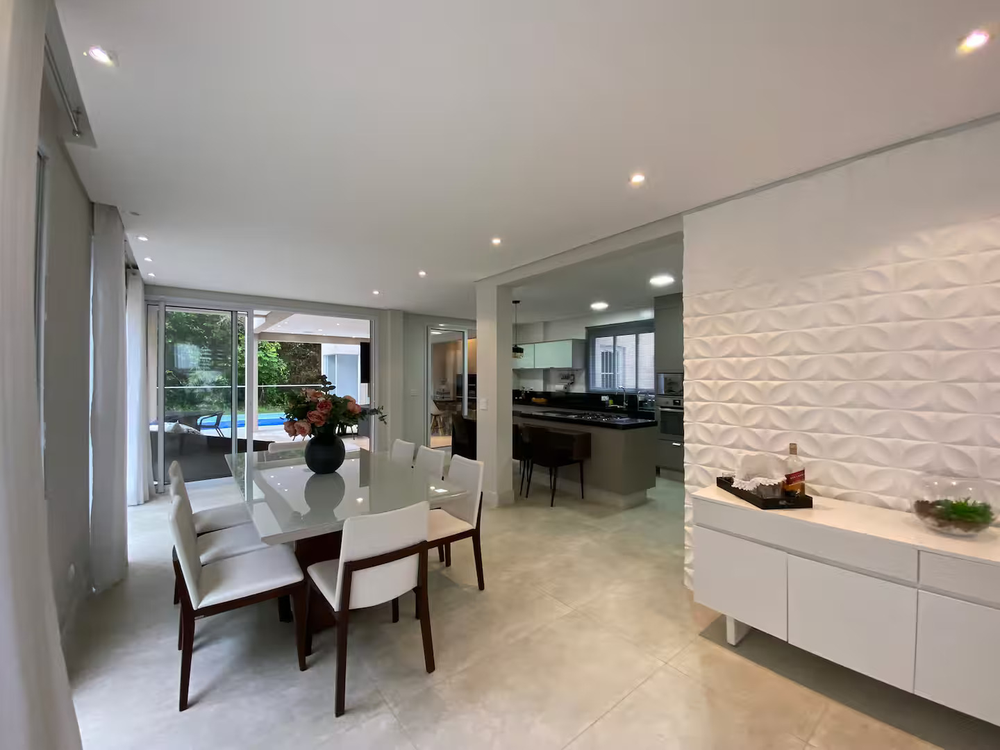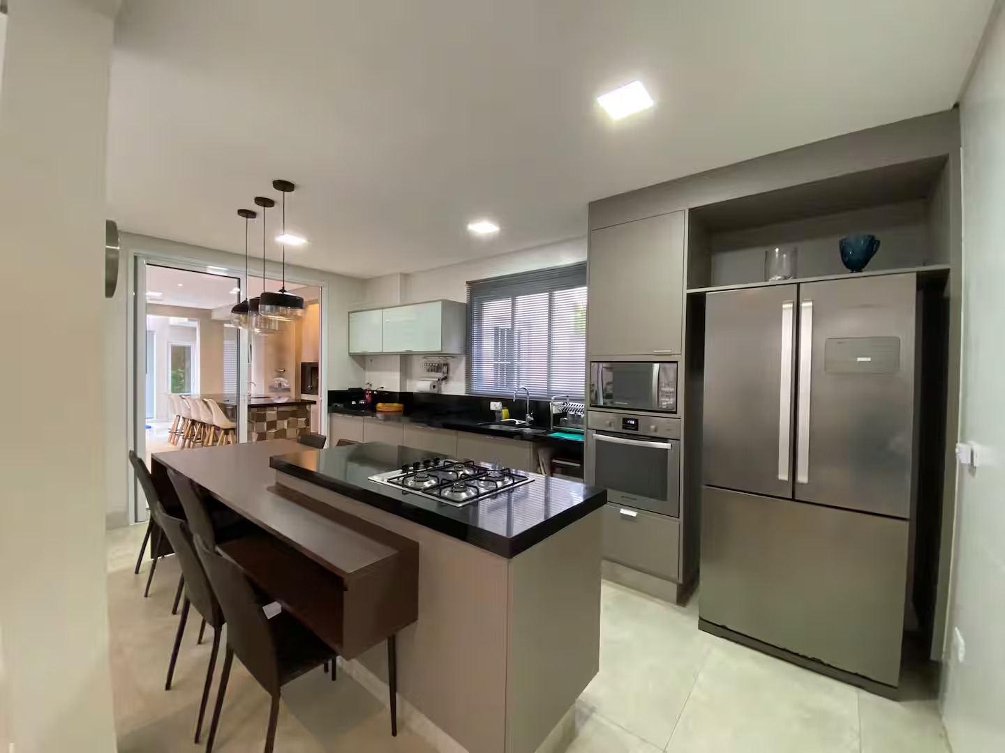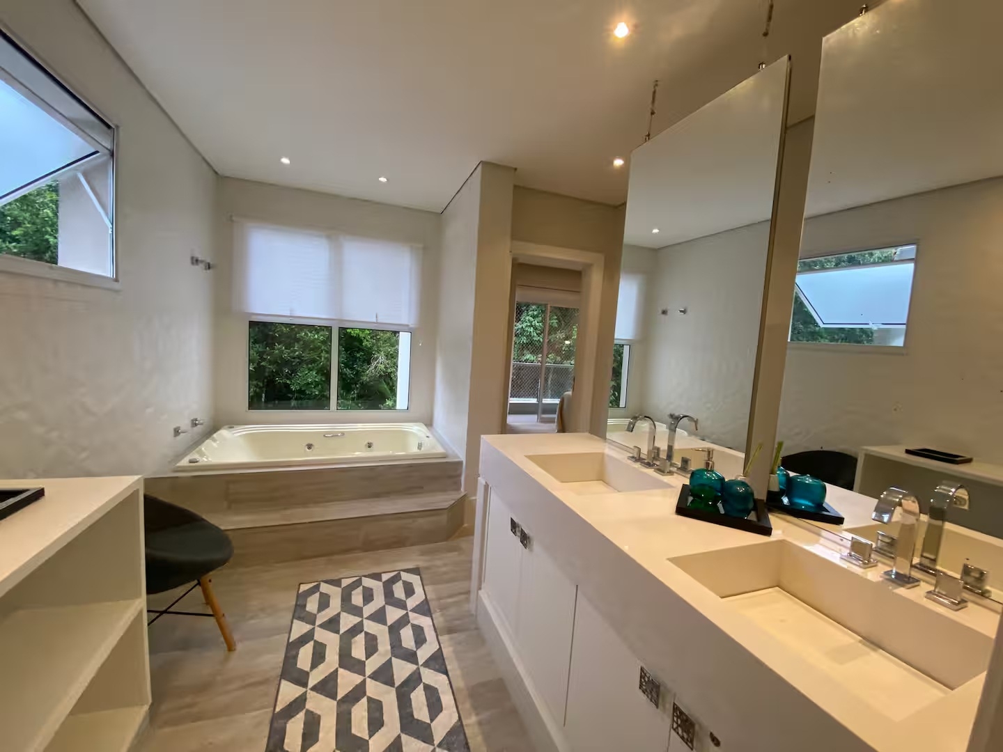 A casa possui 2 cozinhas equipadas, churrasqueira, forno a lenha, sauna e piscina com vista para a mata preservada. A cerca da piscina pode ser removida, ideal para quem viaja com crianças ou pets.