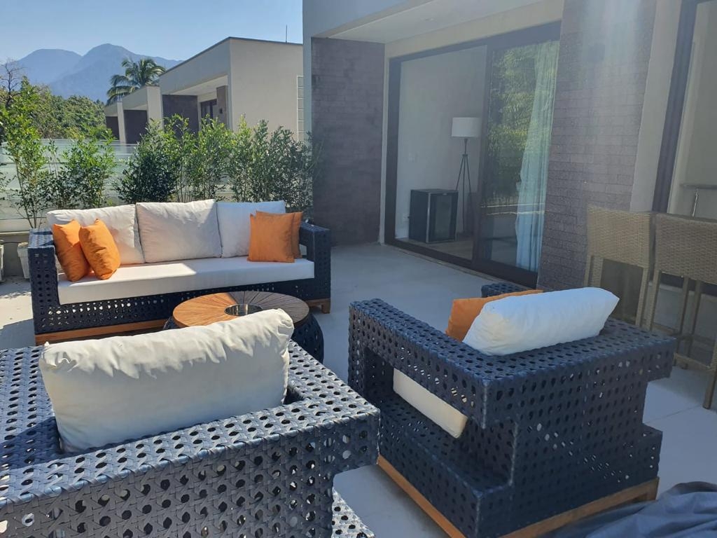 Triplex novíssimo, de alto padrão em condomínio pé na areia, na tranquila praia do Engenho. Possui área gourmet, com churrasqueira, piscina e sauna privativas. Conta com duas salas, de estar e jantar, muito amplas e confortaveis. No segundo pavimento, as 4 suítes aconchegantes e no piso superior uma sala de TV e um terraço com vista para o mar.