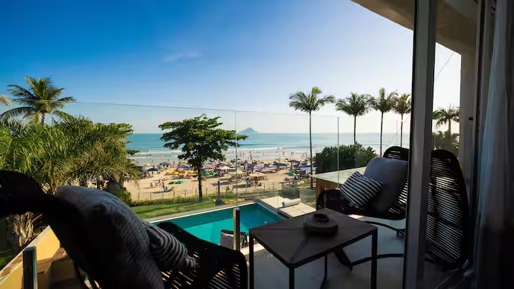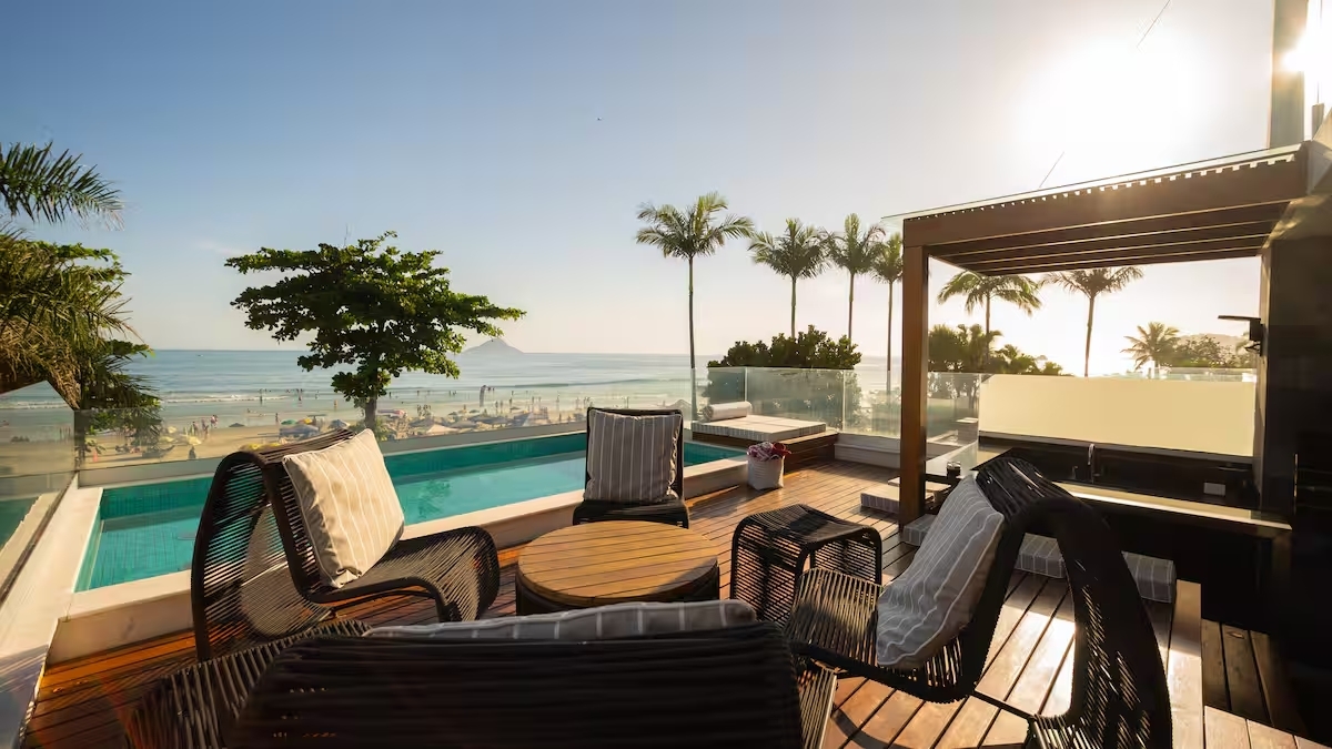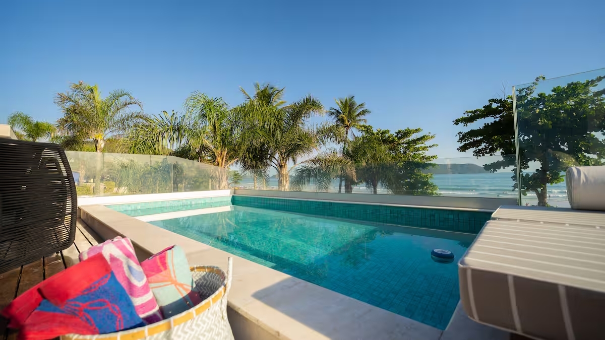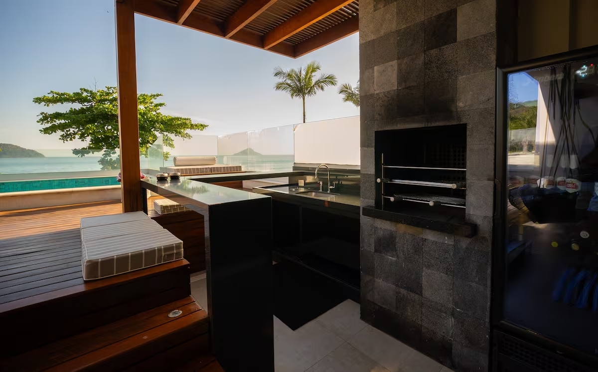A ampla área gourmet integrada, de frente para o mar, conta com piscina privativa e uma vista simplesmente deslumbrante — o cenário perfeito para momentos especiais ao pôr do sol.
