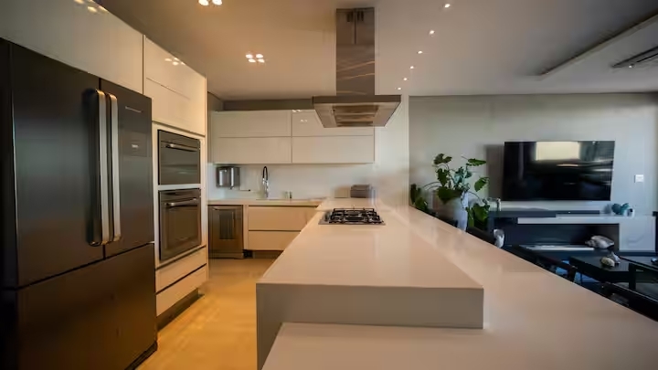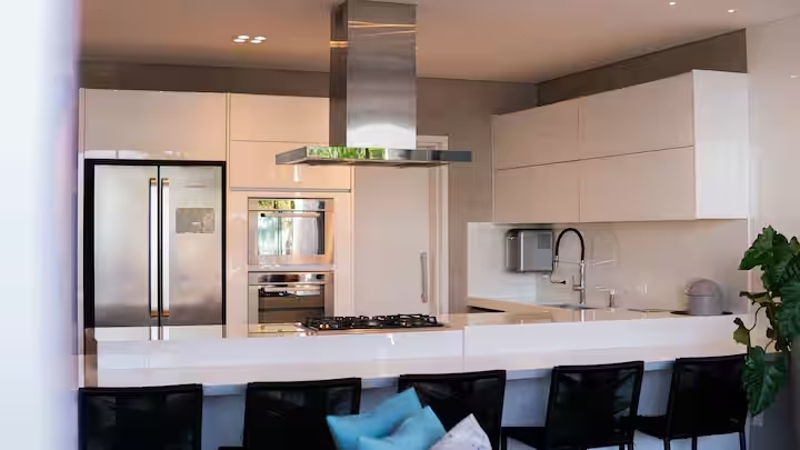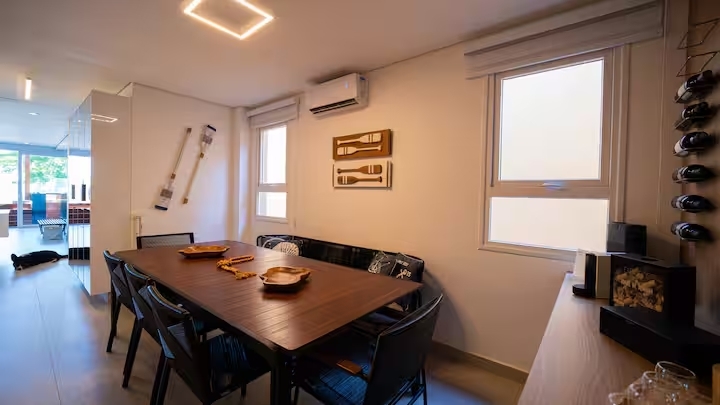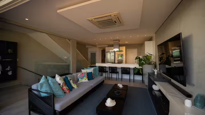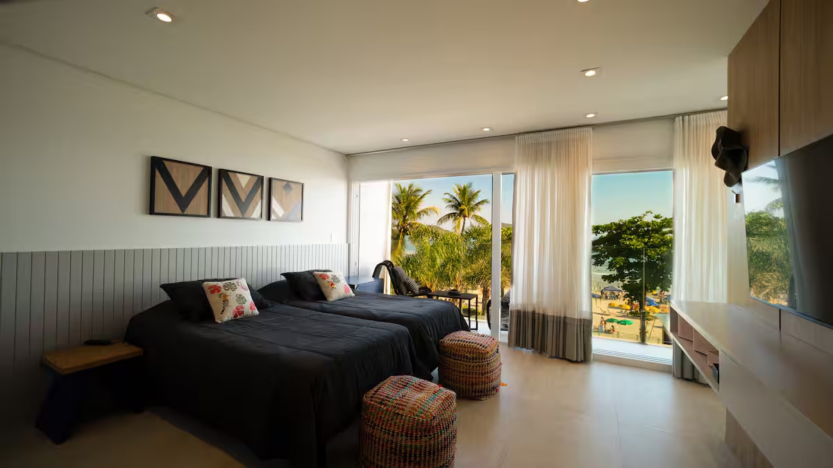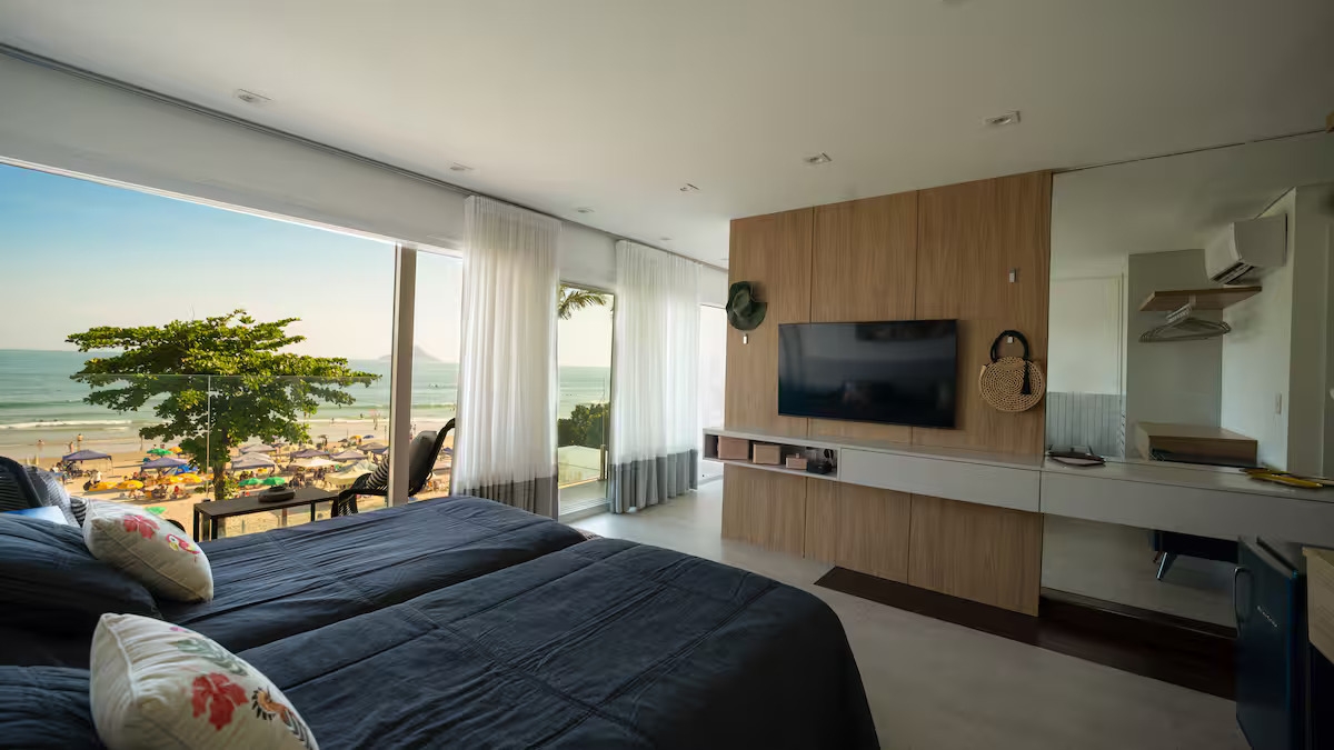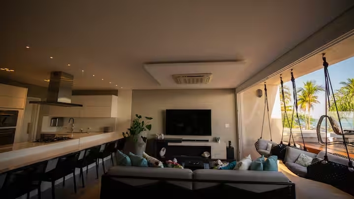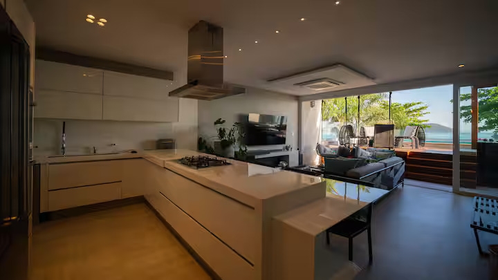 A sala e a cozinha também voltadas para o mar proporcionam integração total dos ambientes, criando uma atmosfera leve, sofisticada.
