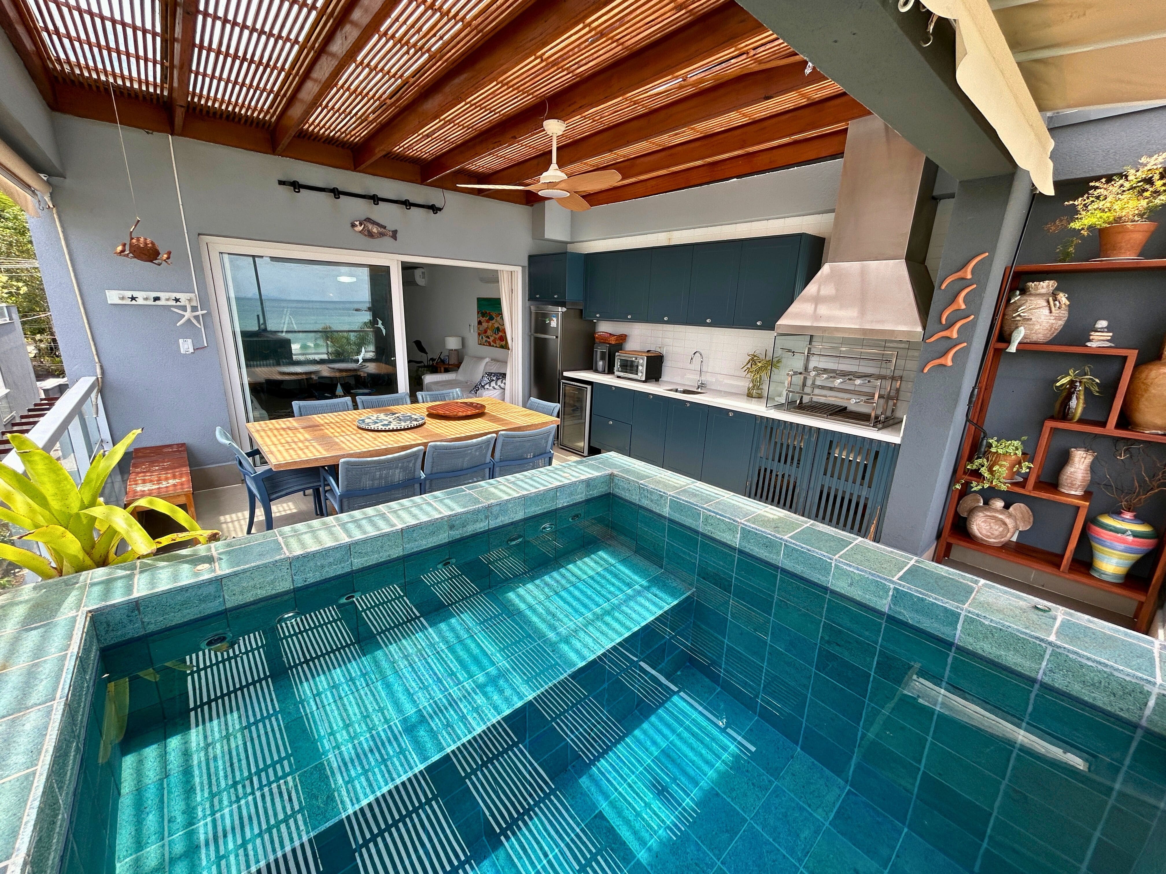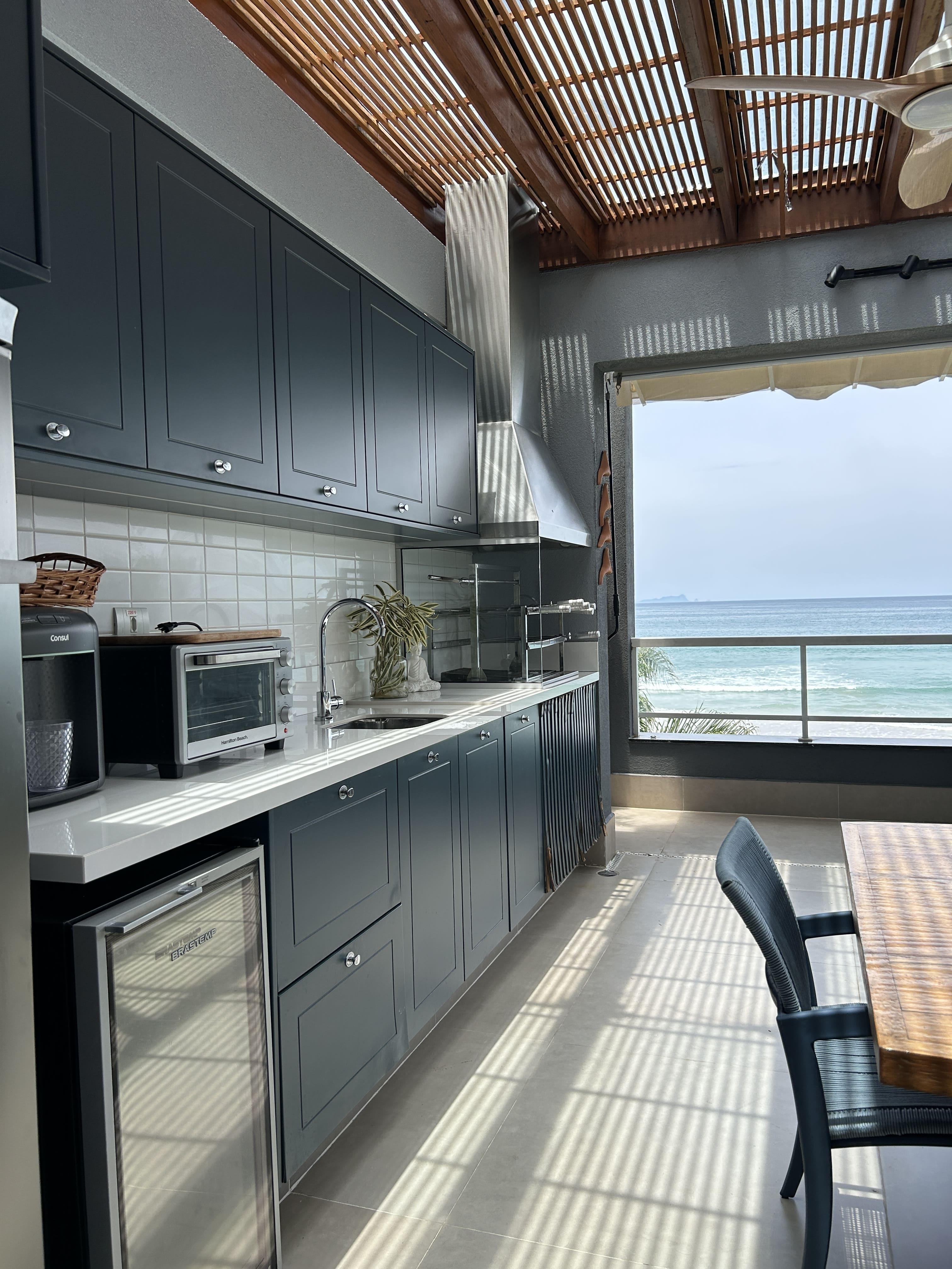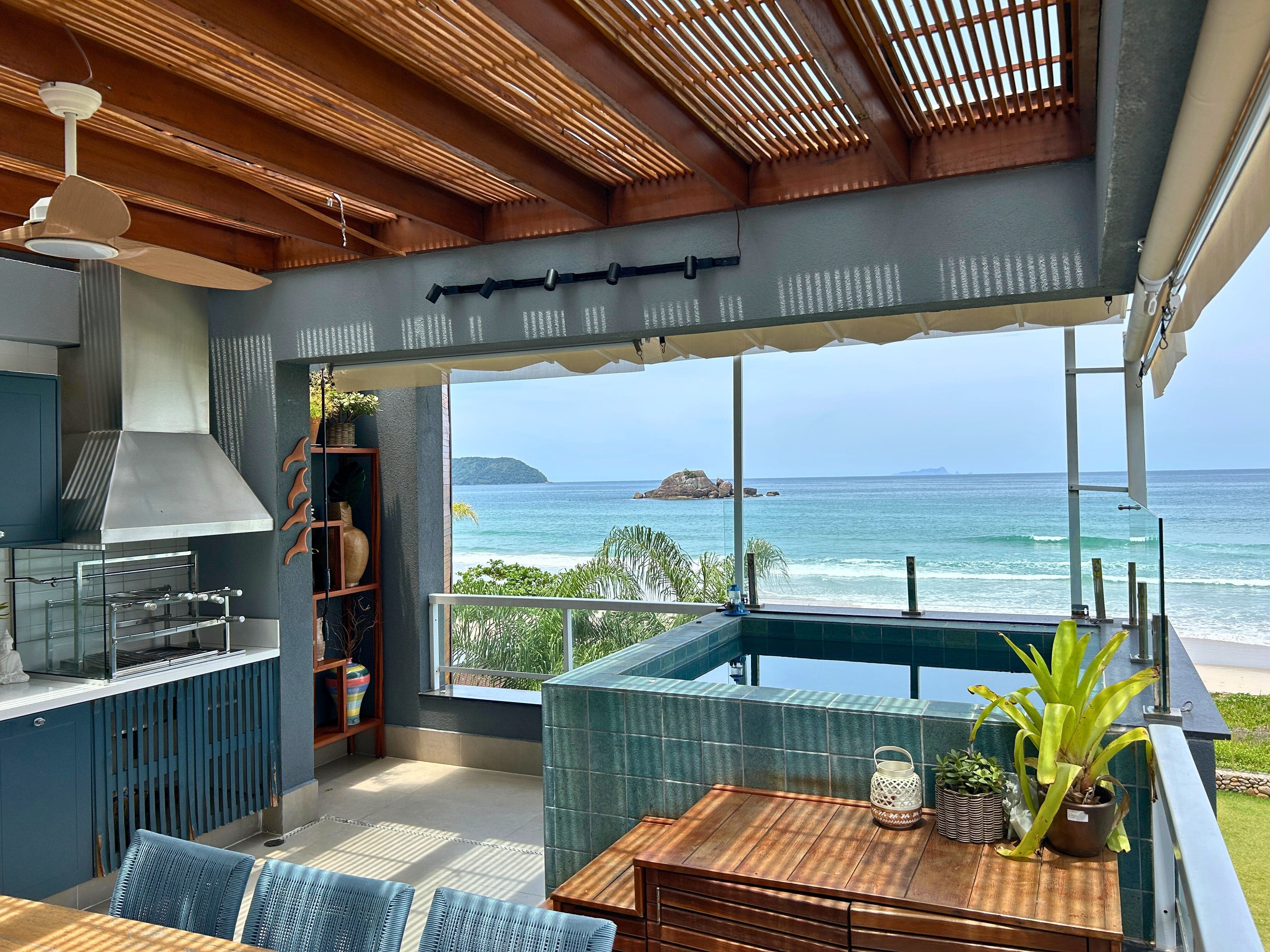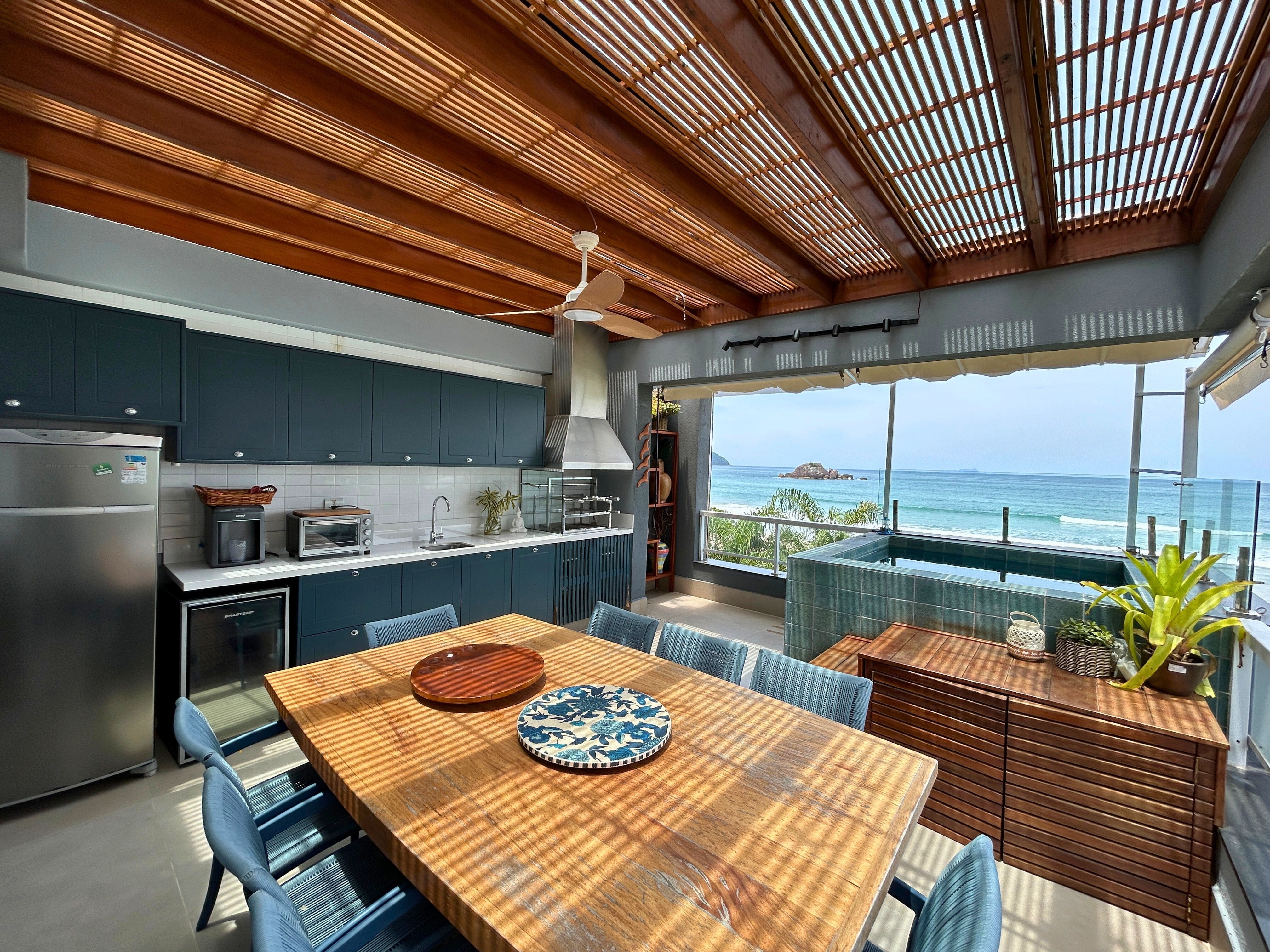 A área de churrasqueira com jacuzzi privativa, sala de estar e cozinha são ambientes integrados e com vista para o mar.