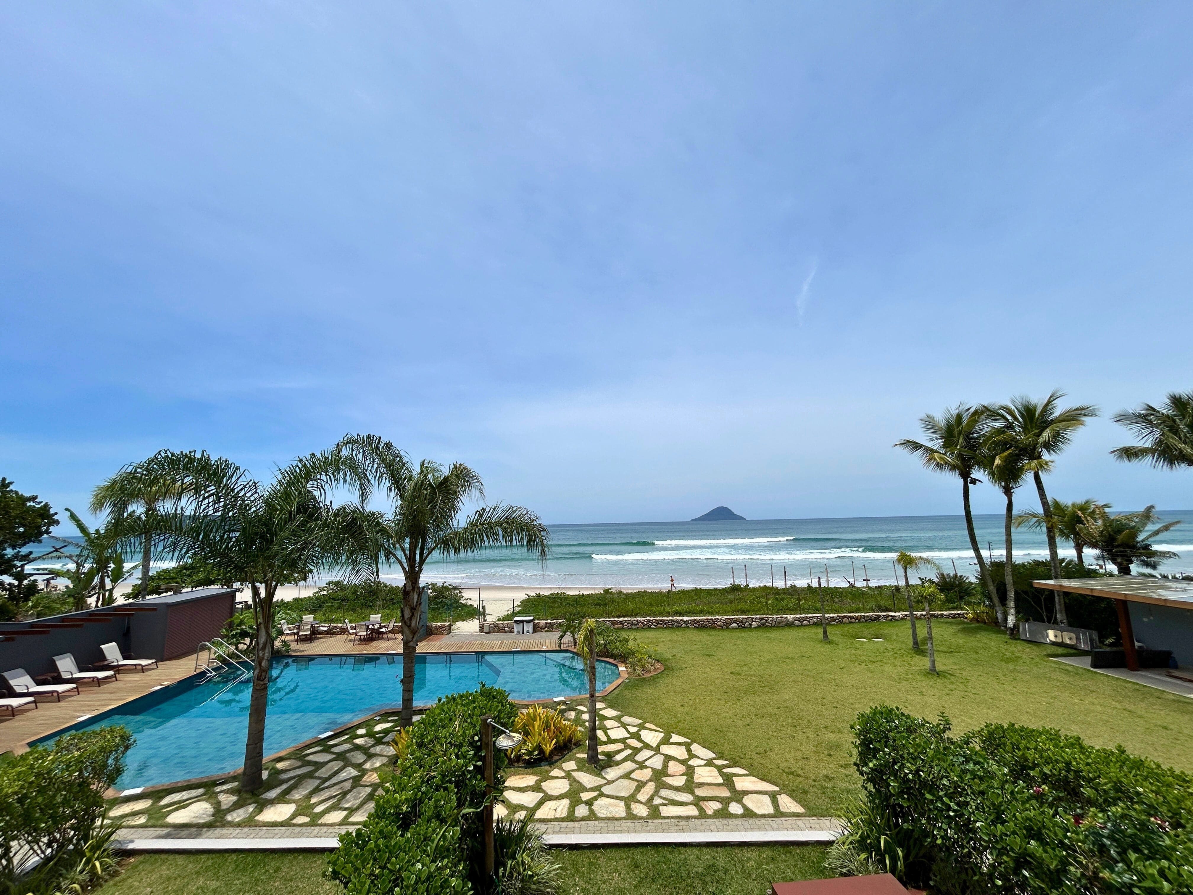 O condomínio possui piscina frente ao mar, portaria 24h e serviço de praia.