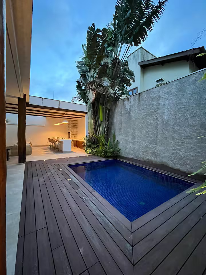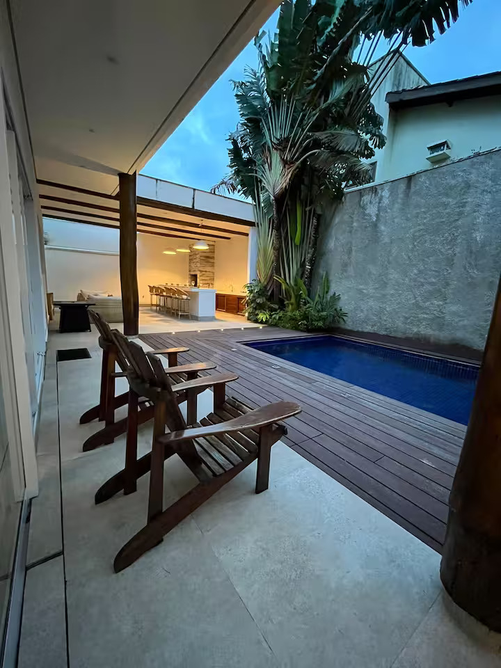 Área externa com piscina privativa, churrasqueira e serviço de praia completo