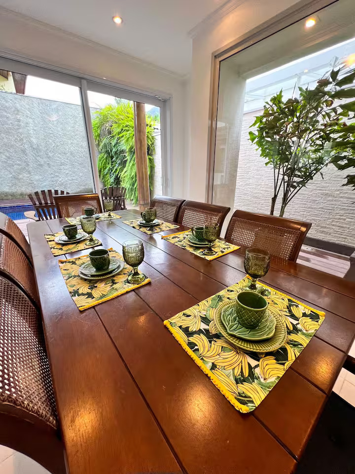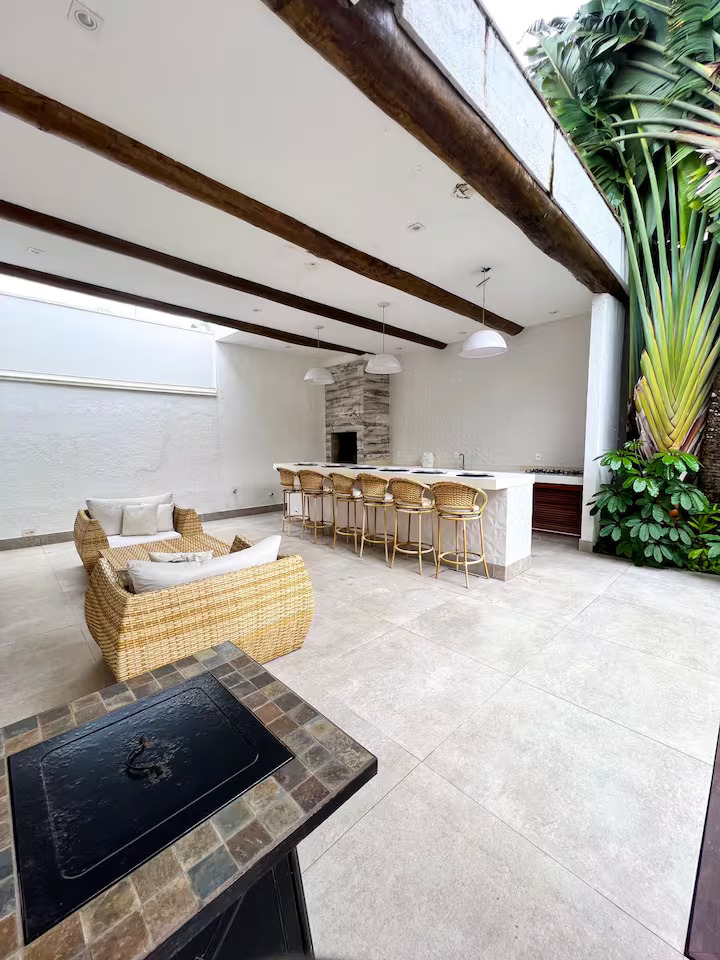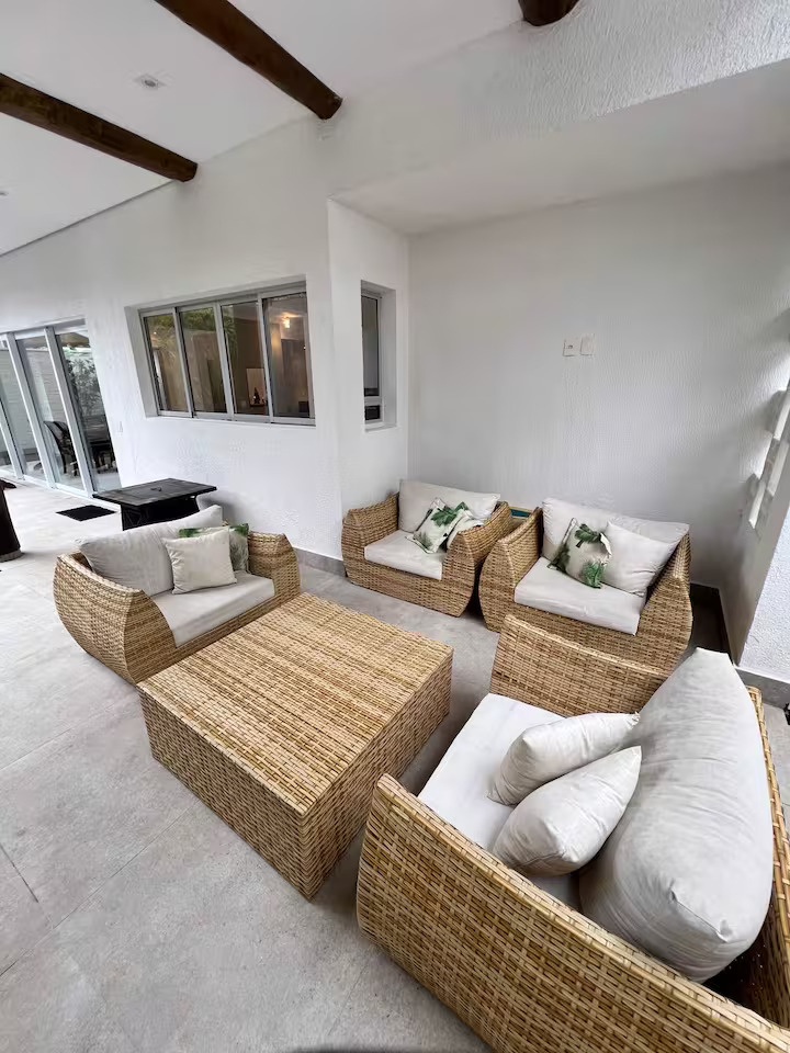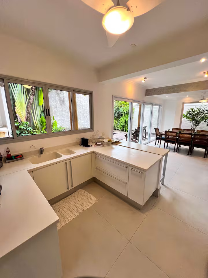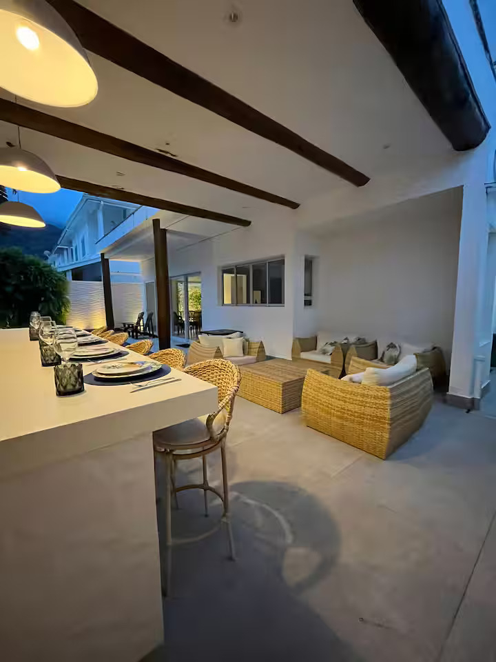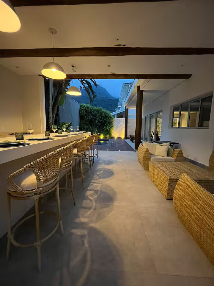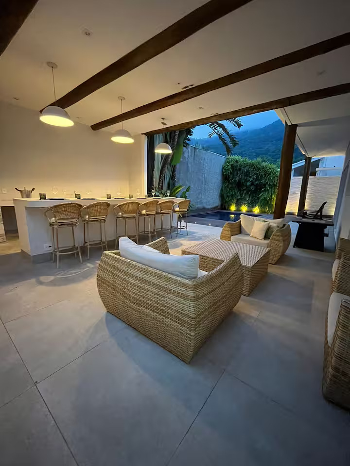 Casa charmosa e confortável em condomínio fechado na avenida principal de Maresias, a poucos metros da praia (entrada 13). São 4 suítes, além de salas de estar, jantar e TV climatizadas.
