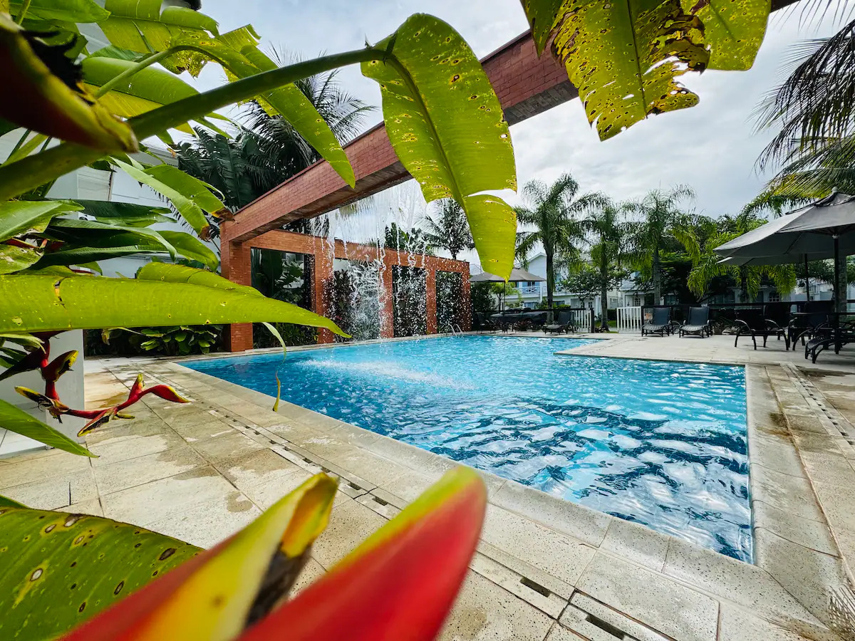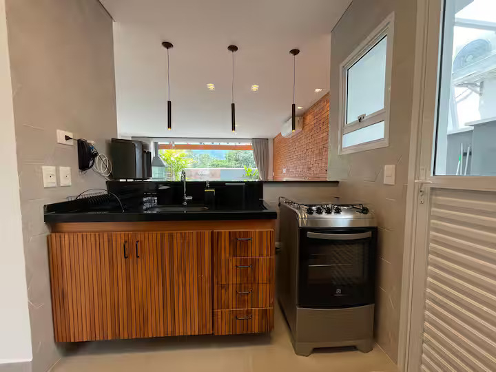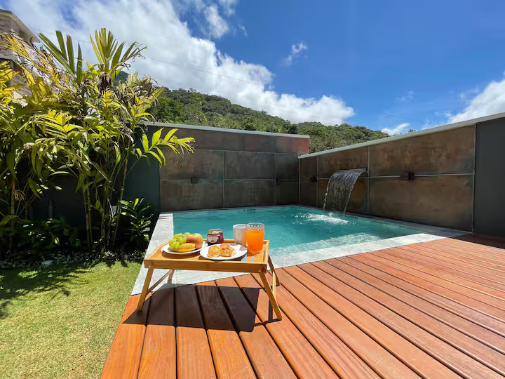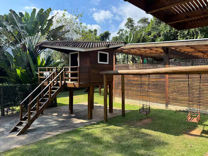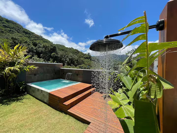 Conta com piscina privativa com cascata, área gourmet com churrasqueira e cozinha completa.